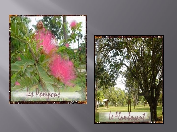 Jardin Botanique Nous pouvons voir de nombreuses espèces d’arbres mais aussi de fleurs et de fruits. De différentes tailles, couleurs et formes. Il y a le parfum de différentes fleurs (Rose, Hibiscus…) Le son du vent à travers les feuilles des arbres et des buissons.