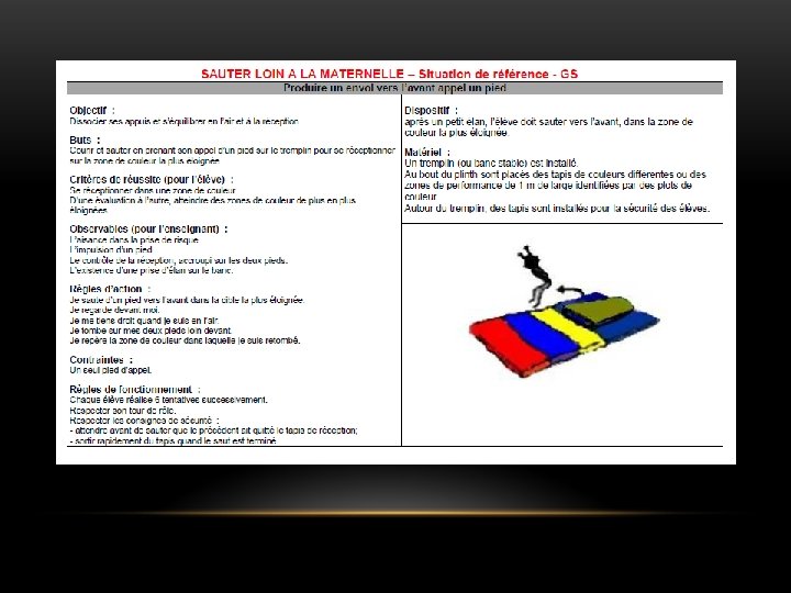 LOGIQUE INTERNE DE L’ACTIVITÉ • Définition (INRP) : « Produire, entretenir, restituer et utiliser de façon optimale une énergie pour la transmettre au corps ou à un engin, pour sauter le plus haut ou le plus loin possible, courir le plus vite ou le plus longtemps possible, et envoyer un engin le plus loin possible dans un espace normé où se réalisent, se mesurent et se comparent des performances. » Ø Activité liée à la notion de performance (on parlera « d’exploit » en maternelle) ; Ø Conduites motrices efficientes liées aux verbes d’action « courir » , « lancer » et « sauter » ; Ø Rapport à l’espace et à un environnement aménagé.