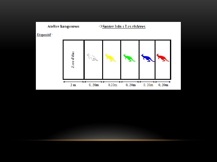 Sauter – La rivière aux crocodiles Dispositif Les élèves sont dans la zone libre. Au signal ils doivent franchir la rivière sans « tomber » dedans, pour atteindre la zone refuge. Possibilité de faire intervenir des lions qui prennent en chasse les gazelles au moment du signal. Critères de réussite La zone est franchie. Les pieds touchent en premier la zone refuge et assurent la réception. Prise d’élan et pas d’arrêt avant l’impulsion. Pied d’appui déterminé. Variables Taille de la rivière, taille de la zone libre. Variante Organiser le dispositif en parcours avec plusieurs rivières consécutives à franchir pour éviter que les lions n’attrapent les gazelles jusqu’à la zone refuge.