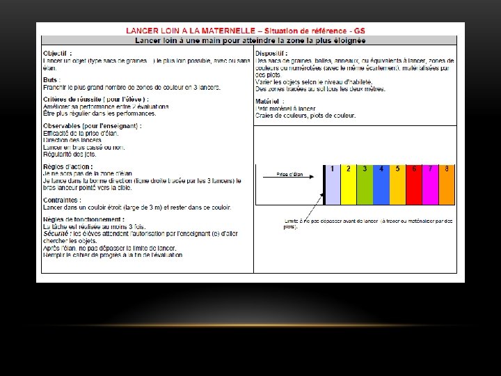 PRENDRE EN COMPTE LE DÉVELOPPEMENT DE L’ENFANT • Lancer. A partir du moment où l’enfant peut attraper des objets, des tentatives de lancer vont apparaître. Il s’agira d’abord de simples ouvertures de la main puis de projections vers le sol. Ce n’est qu’autour de 2 -3 ans qu’un geste de lancer va apparaître, geste désordonné, sans réelle efficacité ni recherche de cible. Puis le souci de direction apparaît, une orientation du lancer se précise, mais il reste de faible amplitude, imprécis. Le corps entier semble se projeter en avant en même temps que le projectile. Après 4 ans les formes de lancer se diversifient (à 1 main, à 2 mains, à bras cassé, au dessus de la tête…) et s’adaptent de mieux en mieux au projectile, à la taille et à la distance de la cible. Les lancers vont d’abord gagner en précision puis en distance. La possibilité de coordonner un élan pour lancer plus loin est beaucoup plus tardive. Ø Il est primordial de proposer aux élèves des situations de lancer en faisant varier au maximum : - les projectiles en taille, forme, poids, encombrement (ne pas se limiter aux balles et ballons mais faire lancer des objets longs, circulaires…) - les cibles en distance (de plus en plus éloignées au fur et à mesure que l’enfant grandit), en taille (très grande pour les enfants les plus jeunes), placement (cibles au niveau du regard, au sol, en hauteur, au dessus de la tête…) - les situations de lancer individuelles et collectives (balles brûlantes) - les moyens de vérifier le résultat (cibles sonores, qui accrochent le projectile, projectile laissant une marque…)