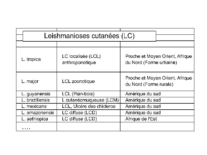 LES AUTRES LEISHMANIOSES Ancien et Nouveau Monde LCL Bouton d’Orient, Pians-Bois