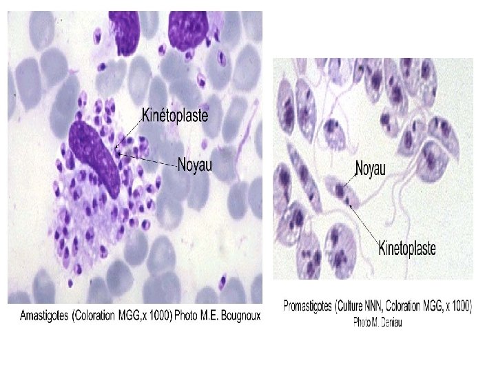 Leishmanioses viscérales (LV) Biologie v DIAGNOSTIC DE CERTITUDE : Ø VISUALISATION DES FORMES AMASTIGOTES § prélèvement de moelle osseuse: gold standard ponction splénique chez les anglo-saxons § intérêt du sang périphérique chez les immunodéprimés (après concentration du sang) § RECUEILLIR SUR CITRATE POUR FROTTIS ET CULTURE § Grande fréquence du diagnostic fortuit par biopsies digestives, cutanées ou lavages broncho-alvéolaires chez les malades co-infectés par le VIH