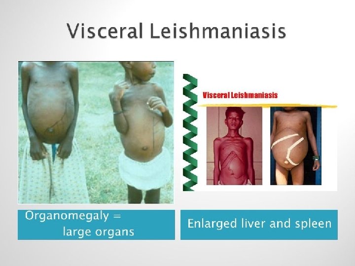 Leishmanioses viscérales (LV) Différentes formes cliniques • LVZ classique (jeune enfant) : fièvre irrégulière, pâleur, splénomégalie • LVZ de l’adulte : triade moins constante et immunodépression permanente dans un cas sur deux • LVA (tous les âges) : triade quasi constante avec adénopathies et macules noirâtres ou bistres (kala azar)