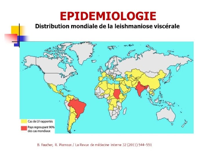 Leishmanioses viscérales (LV) • LV zoonotique (LVZ) due à L. infantum réservoir: le chien Sporadique en Chine, Amérique latine (Brésil+++), Bassin méditerranéen • LV anthroponotique (LVA) due à L. donovani réservoir: l’homme Epidémique au Soudan, en Ethiopie, en Inde, au Népal, au Bangladesh