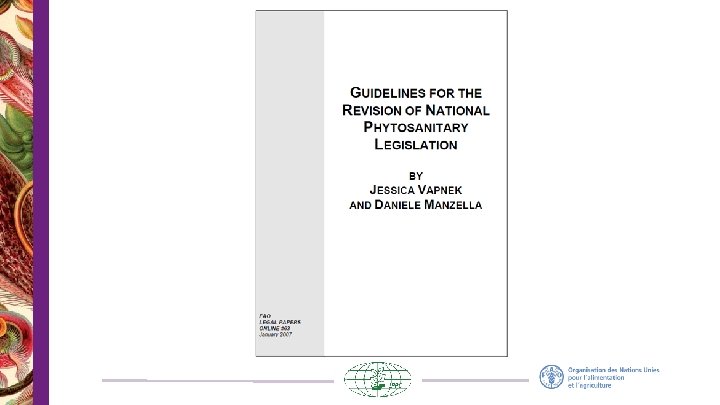 Loi relative à la protection des végétaux Éléments fondamentaux INTRODUCTION PARTIE III § Préambule § Exportation § Champ d’application § Certification phytosanitaire pour l’exportation § Définitions PARTIE IV PARTIE I § Surveillance et lutte contre les organismes nuisibles § Administration (ONPV, Inspections, laboratoires, Coordination) PARTIE V § Obligations des inspecteurs § Infractions et sanctions § Pouvoirs des inspecteurs PARTIE VI PARTIE II § Divers (régime de responsabilité, recours, abrogation et clause de sauvegarde, pouvoir de réglementer) § Importation Bureau juridique de la FAO
