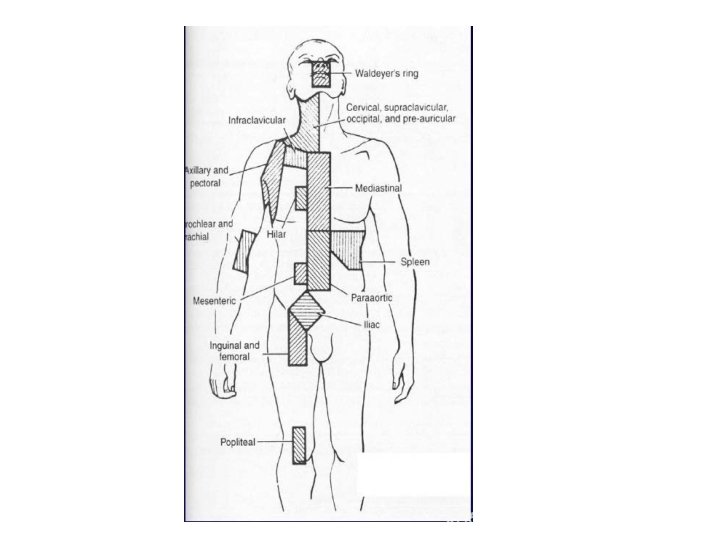 Examen clinique L'examen clinique mettra en évidence certaines localisations de la maladie. Les ganglions lymphatiques restent le site privilégié de l'atteinte. Les adénopathies sont plutôt fermes et peuvent être volumineuses, devenant confluentes et formant de grosses masses tumorales. Les principales aires concernées sont le cou, les creux axillaires, le médiastin antérieur et la région lombo-aortique. La rate est souvent envahie (environ 40 % des cas). L'atteinte médiastinale peut mener à un syndrome cave supérieur. L'extension peut se faire vers la plèvre, le péricarde, le poumon et la paroi thoracique. Rate, poumon, moelle osseuse, foie et os sont les sites extraganglionnaires les plus fréquemment envahis.