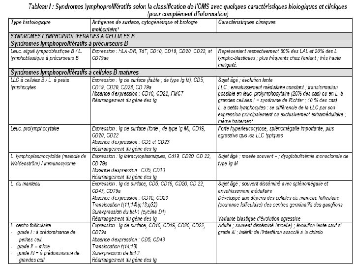 ANATOMIE PATHOLOGIQUE Histologie La classification actuelle des hémopathies lymphoïdes appelée WHO (World Health Organisation = OMS Organisation Mondiale de la Santé) a été proposée en 1994 et complétée en 1997 (Tableau I). Cette classification est très complexe mais discrimine bien les différentes entités. Elle sépare totalement les syndromes lymphoprolifératifs selon leur phénotype immunologique B ou T et inclut l'ensemble des syndromes lymphoprolifératifs dont plusieurs n'étaient pas pris en compte dans les classifications précédentes (leucémies de la lignée lymphocytaire, leucémie à tricholeucocytes, myélome, maladie de Hodgkin). Elle a également le mérite d'individualiser clairement certaines entités fréquentes mais non prises en compte antérieurement [exemple : lymphome du manteau, lymphomes du MALT (mucosaassociated lymphoid tissue)]. Cette classification repose sur la morphologie mais aussi sur l'immunophénotypage, la cytogénétique et la biologie moléculaire.