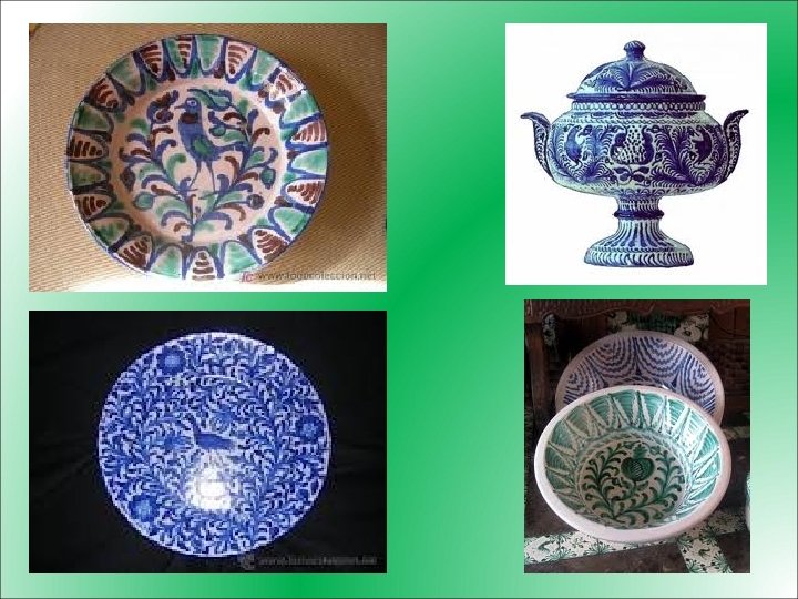 Les ornements géométriques et végétaux sont arrivés à l'époque nasride. Les couleurs dominantes sont le vert (depuis le VIIIe s. ), le marron (depuis le XIIIe s. ) et le bleu (depuis le XVIe s. ). À noter que l'apparence de l'actuelle céramique populaire de Grenade, qui reprend toutes le techniques antérieures, date du XVIIIe s. Multitude d'objets sont confectionnés, tels des plateaux, des coupes, des carafes à eau, des répicients pour l'huile, des services à café, etc. . .