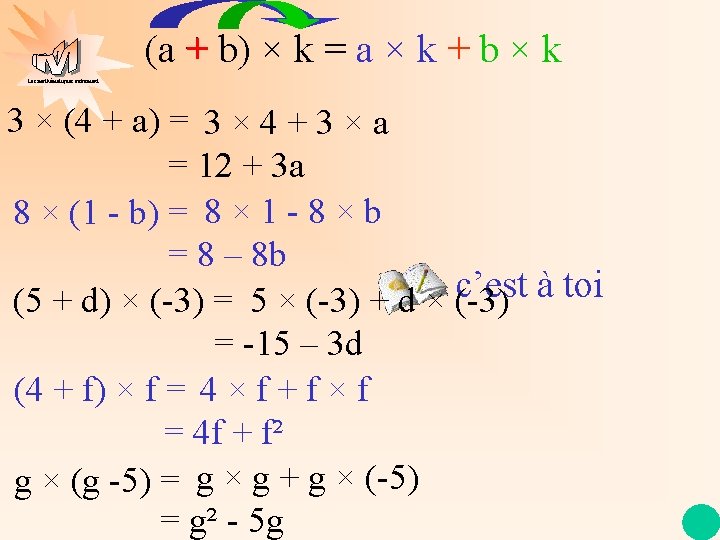 2) La distributivité (a + b) × k = a × k + b × k (2 + b) × 5 = 2 × 5 + b × 5 Les mathématiques autrement = 10 + 5 b (a - 3) × 4 = a × 4 - 3 × 4 = 4 a - 12 (k + 7) × k = k × k + 7 × k = k² + 7 k (3 + h) × (-5) = 3 × (-5) + h × (-5) = -15 + (-5)h = -15 - 5 h retour