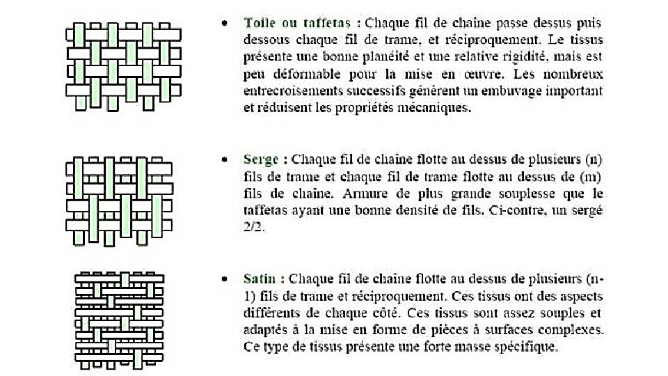 Les fibres d’aramide (Kevlar ®) Les fibres d’aramide ont de bonnes propriétés mécaniques en traction et bonne résistance aux chocs (excellente absorption des vibration) et à l’abrasion, au feu et à la chaleur (Leur dilatation thermique est nulle), aux solvants organiques (exemple : carburants). Leur masse volumique est faible Leurs inconvénients sont un mauvais comportement en compression, usinabilité délicate : grande difficulté à couper (résistance au cisaillement) ou à usiner, reprise d'humidité importante, sensibilité aux rayons ultraviolets, prix élevé. Les aramides sont utilisés dans de nombreuses applications à haute technologie dans l’aéronautique, l’aérospatiale, la construction navale, le secteur militaire pour fabriquer par exemple des gilets pare-balles ou des casques. On rencontre trois types de tissages courant: • sergé, • satin ou, • taffetas; Les grammages vont de 100 à 300 gr/m².