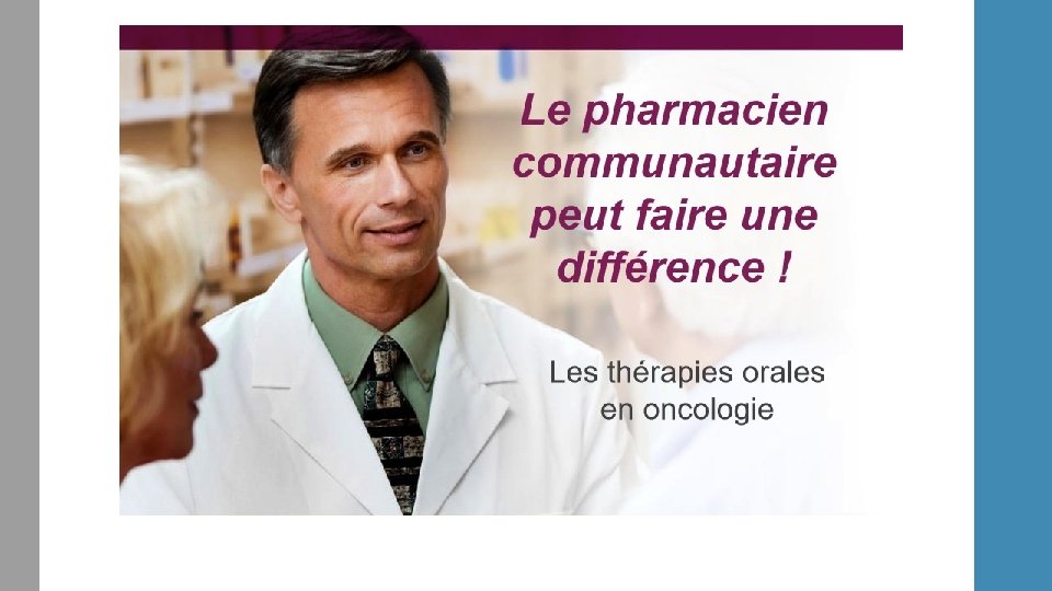 Références • Bennett AV, Jensen RE, Basch E. Electronic patient-reported outcome systems in oncology clinical practice. CA Cancer J Clin. oct 2012; 62(5): 337‑ 47. • Lam MS, Cheung N. Impact of oncology pharmacist-managed oral anticancer therapy in patients with chronic myelogenous leukemia. J Oncol Pharm Pract. déc 2016; 22(6): 741‑ 8. • Chapman PB, Hauschild A, Robert C, Haanen JB, Ascierto P, Larkin J, et al. Improved survival with vemurafenib in melanoma with BRAF V 600 E mutation. N Engl J Med. 30 juin 2011; 364(26): 2507‑ 16. • Edwards SJ, Abbott R, Edwards J, Le. Blanc M, Dranitsaris G, Donnan J, et al. Outcomes assessment of a pharmacist-directed seamless care program in an ambulatory oncology clinic. J Pharm Pract. févr 2014; 27(1): 46‑ 52. • Basch E, Deal AM, Dueck AC, Scher HI, Kris MG, Hudis C, et al. Overall Survival Results of a Trial Assessing Patient-Reported Outcomes for Symptom Monitoring During Routine Cancer Treatment. JAMA. 11 2017; 318(2): 197‑ 8. • Motzer RJ, Hutson TE, Tomczak P, Michaelson MD, Bukowski RM, Rixe O, et al. Sunitinib versus interferon alfa in metastatic renal -cell carcinoma. N Engl J Med. 11 janv 2007; 356(2): 115‑ 24. • Basch E, Deal AM, Kris MG, Scher HI, Hudis CA, Sabbatini P, et al. Symptom Monitoring With Patient-Reported Outcomes During Routine Cancer Treatment: A Randomized Controlled Trial. J Clin Oncol. 20 févr 2016; 34(6): 557‑ 65. • Colombo LRP, Aguiar PM, Lima TM, Storpirtis S. The effects of pharmacist interventions on adult outpatients with cancer: A systematic review. J Clin Pharm Ther. août 2017; 42(4): 414‑ 24. • Thoma J, Zelkó R, Hankó B. The need for community pharmacists in oncology outpatient care: a systematic review. Int J Clin Pharm. août 2016; 38(4): 855‑ 62.