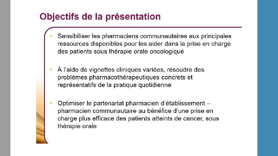 Objectifs de la présentation • Illustrer le contexte des médicaments par voie orale en oncologie Commercialisation des MAVO Bénéfices cliniques et coûts associés • Distinguer le suivi actif et le suivi passif des symptômes associés à la prise de ces médicaments Prise en charge des effets secondaires Activation du patient • Discuter des options permettant aux pharmaciens de faire un suivi actif Contexte hospitalier en Estrie Outils / conférences sur le sujet Prise en charge en milieu communautaire
