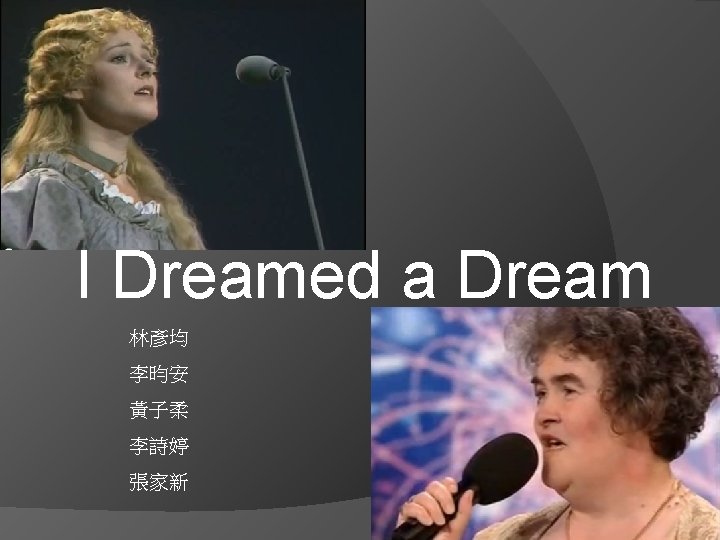 � And still I dream he'll come to me That we will live the years together But there are dreams that cannot be And there are storms we cannot weather �I had a dream my life would be So different from this hell I'm living So different now from what it seemed Now life has killed the dream I dreamed � 現實使她無望 http: //www. youtube. com/watch? v=Yt-IBJp. EMz. A