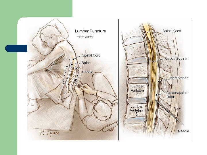 Ponction lombaire l Prélévement de LCR doit être acheminé en URGENCE au laboratoire ( si méningocoque moins de 20 mn entre le prélèvement et l’analyse bactériologique) l Indication : Tout syndrome méningé en l’absence de signe d’HTIC (hypertension intracrânienne) ou de déficit sensitivo-moteur faisant craindre un processus expansif intra-crânien. Syndrome méningé fébrile pur sans signes neurologiques = PL Syndrome méningé fébrile + signes neurologiques = scanner +PL Syndrome méningé brutal non fébrile = scanner