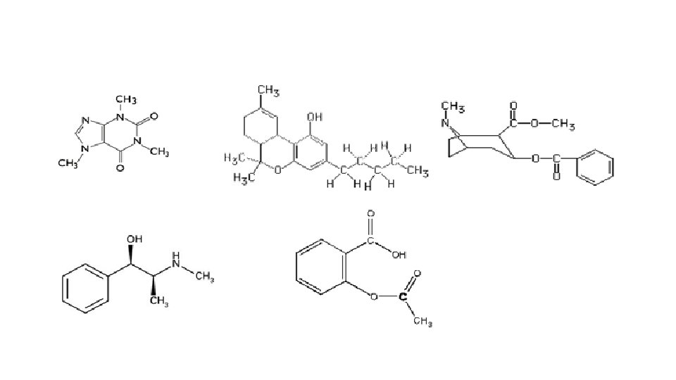 Repérer et entourer les groupes caractéristiques présents dans les formules développées représentées ci-dessous : Molécule 1 : caféine. Molécule 2 : tétrahydrocannabinol (molécule principale du cannabis). Molécule 3 : cocaïne. Molécule 4 : éphédrine (espèce chimique stimulante). Molécule 5 : aspirine (médicament).