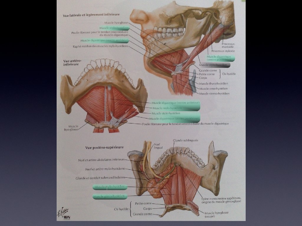 Région Sus. Hyoïdienne Constituée de 4 muscles qui constituent le plancher buccal : Muscles Insertions / Terminaisons Fonctions Innervation Abaisse la mandibule Elève l’os Hyoïde N. Mylohyoïdien (V. 3) Abaisse la mandibule Tracte l’os Hyoïde en haut et en avant N. Hypoglosse (XII) Ligne Mylo-Hyoïdienne / Mylo-Hyoïdien Corps Os Hyoïde + Raphé Mandibulo-Hyoïdien Face ant. du corps de l’Os Hyoïde / Génio-Hyoïdien Digastrique (ventre Ant. et Post. ) Stylo-Hyoïdien Epine Mentonnière Inférieure (face interne mandibule) Incisure Mastoïdienne / Elévateur de l’Os Hyoïde Fosse Digastrique mandibulaire (ventre ant et post séparés par un tendon intermédiaire, maintenu dans une poulie fibreuse, fixée sur l’os hyoïde) Ventre Ant : Abaisse la mandibule Ventre Post : Tire en arrière l’os hyoïde Processus Styloïde / Bord Lat. du corps de l’os Hyoïde Tire l’Os Hyoïde en haut et en arrière lors de la déglutition N. Mylohyoïdien (V. 3) (ventre Ant. ) N. Facial (VII) (ventre Post) N. Facial (VII)