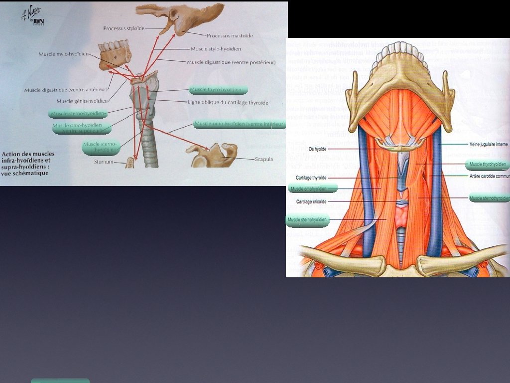 Région Sous-Hyoïdienne Muscles Insertions / Terminaison Grande corne et face adjacente du corps de l’Os Hyoïde / Thyro-Hyoïdien Ligne oblique sur la face antérosupérieure du cartilage thyroïde Fonctions Elévateur du larynx Abaisseur de l’Os Hyoïde Innervation N. Hypoglosse (XII) (par une branche terminale de C 1) Corps de l’Os Hyoïde en dedans du muscle Omo-Hyoïdien / Sterno-Hyoïdien Versant postérieur de l’articulation sterno claviculaire et partie adjacente du manubrium sternal Abaisseur de l’Os Hyoïde après la déglutition N. Hypoglosse (XII) (par une branche terminale de C 1 à C 3) Bord Inférieur du Corps de l’Os Hyoïde / Omo-Hyoïdien Bord supérieur de la Scapula en dedans de l’échancrure coracoïdienne Cartilage Thyroïde / Sterno-Thyroïdien Face postérieure du sternum Abaisseur et stabilisateur de l’Os Hyoïde N. Hypoglosse (XII) (par une branche terminale de C 1 à C 3) N. Hypoglosse (XII) Abaisse le cartilage thyroïde, (par une branche terminale de C 1 à C 3) donc le larynx