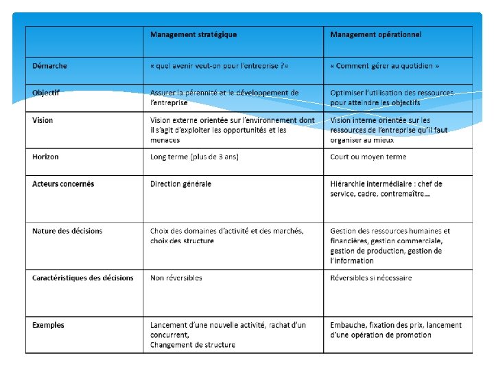 Le dechiffrement des notions v Le niveau strategique – implique le moyen d’organisation de la societe entiere; v Le niveau fonctional - determine la realisation des objectifs derives – ont un caractere periodique; v Le niveau operatif – cet etape suit la realisation des objectifs propres et la prevision des ecarts ;