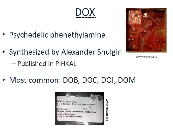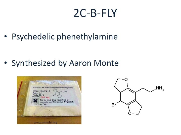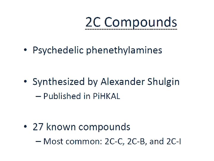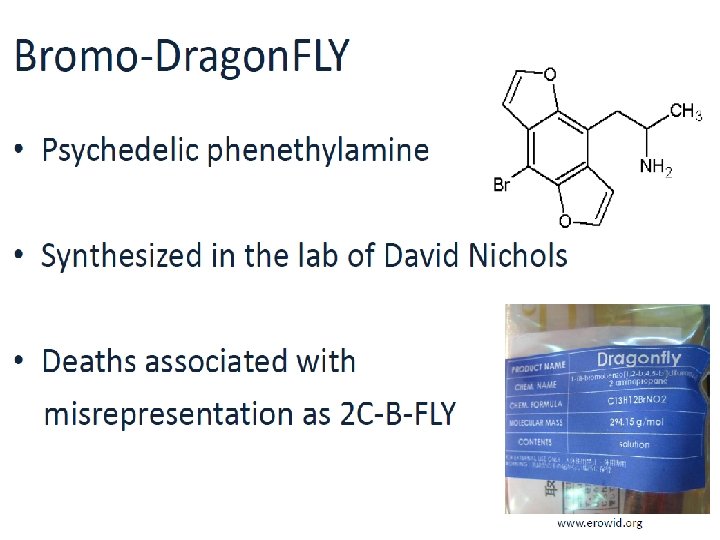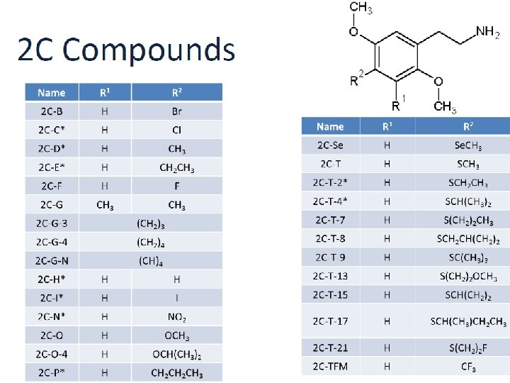 LES PHENETHYLAMINES DE SYNTHESE DES STIMULANTS ET HALLUCINOGENES § Des drogues “haute couture” apparentées à l’amphétamine et à la methamphétamine donc stimulantes § Des modifications de leur structure peuvent être à l’origine de propriétés hallucinogènes (bromo-dragonfly) § Un très grand nombre de composés principalement hallucinogènes (> 60) : § Composés 2 C (au nombre de 27 !) § Composés NBOMe (au nombre de 33 !) § Composés DOX (DOB, DOC, DOI, DOM)