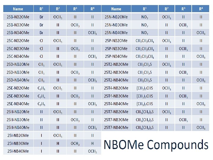 Dérivés N-méthoxybenzyl = NBOMe (série des phenéthylamines) Une série avec de nombreuses nouvelles drogues