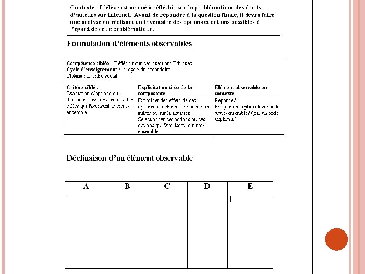 Activité sur la déclinaison d’un élément observable Se placer en équipe-cycle (3 -4 pers. ) Réaliser une échelle d’appréciation à partir de l’observable et du contexte fournis.