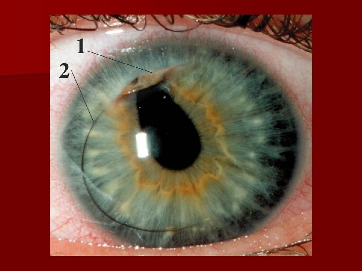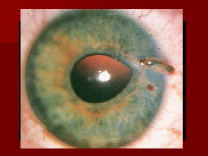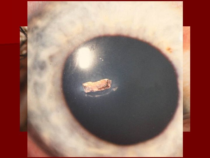 Examen oculaire (suite) Iris : – Intact – Perforation : CEIO +++ – Ruptures sphinctériennes – Iridodialyse – Hernié : déchiqueté, dévitalisé, épithélialisé n Examen segment post : si possible – Etat vitré – Etat rétine n