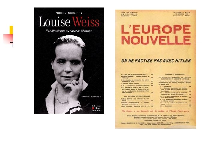 n B) Des hommes de réseaux: Héritage et construction n Coudenhove-Kalergi : existence cosmopolite dans sa famille, n Aristide Briand, les réseaux politiques et socialistes. n Louise Weiss, briandiste, crée la revue l’Europe nouvelle pour défendre la cause de Briand n Jean Monnet, milieu d’affaires, Etats-Unis, engagement auprès de Churchill et de Gaulle. n Paul-Henri Spaak Milieux littéraires et politiques de haut niveau. n Denis de Rougemont Famille aisée, protestante et ouverte au libéralisme social du protestantisme suisse, milieux littéraires n Alexandre Marc, milieu littéraire et politique, intellectuel de l’avantguerre. n Absence de réseaux initiaux chez Briand, De Gasperi, Schuman, Adenauer. Spinelli et Rossi, Guy Mollet