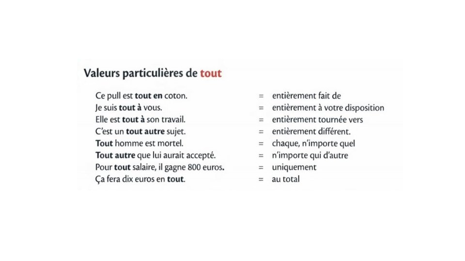 Totalité • Tout (Attention à la place du pronom tout dans la phrase) J’aime tout; je vais tout manger; j’ai tout lu • Tous, toutes (Attention à la prononciation : quand tous est pronom, on prononce le –s final) Les verbes français ne sont pas tous réguliers Elles sont toutes parties hier Les cinémas ont tous fermé leurs portes Ces articles, je les lirai tous • Tout le monde = tous *Tous sont là vs Ils sont tous là / tout le monde est là.