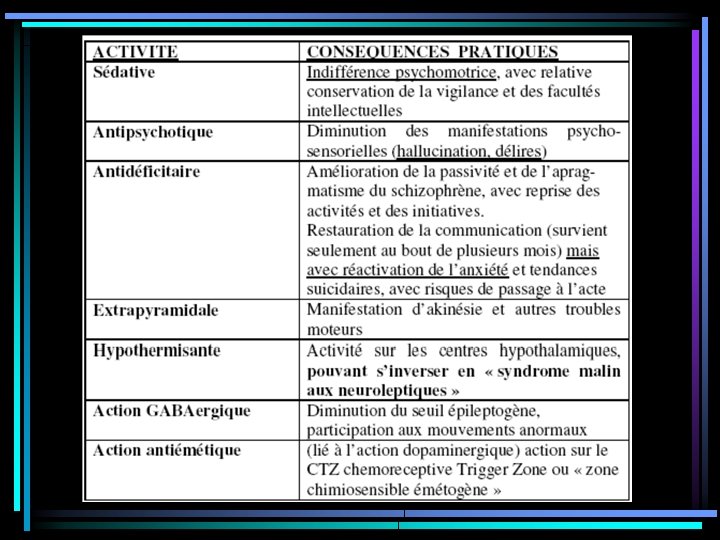 NEUROLEPTIQUES • Effets sur le SNC selon Delay et Deniker – Création d’un état d’indifférence psychomotrice – Efficacité vis-à-vis des états d’excitation et d’agitation – Réduction progressive des troubles psychotiques aigus et chroniques – Production de symptômes extrapyramidaux et végétatifs – Action sous-corticale prédominante