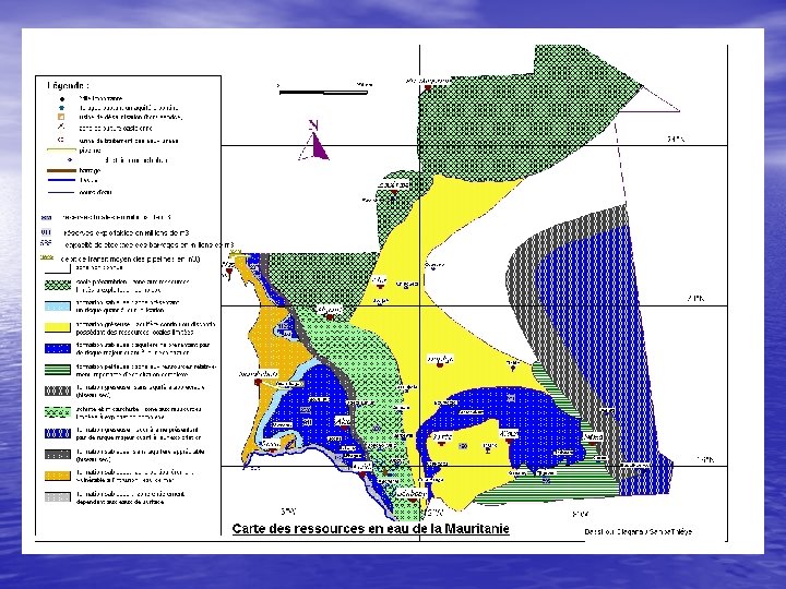 CONCLUSION • les aquifères discontinus, dans la bordure ouest du bassin de Taoudenni, les Mauritanides, la Dorsale Regueïbat ; • les aquifères continus, du bassin côtier, la nappe du Continental Intercalaire du Dhar de Nema et de Walata et les aquifères alluvionnaires des vallées des cours d’eau. Compte tenu de l’irrégularité des précipitations pluviométriques, de la vulnérabilité de certains aquifères et de l’insuffisance des données techniques et scientifiques, l’exploitation des ressources en eau pour quelque fin que ce soit (urbaine, agricole, industrielle etc. ) doit être précédée par une étude menée avec toute la rigueur technique et scientifique.