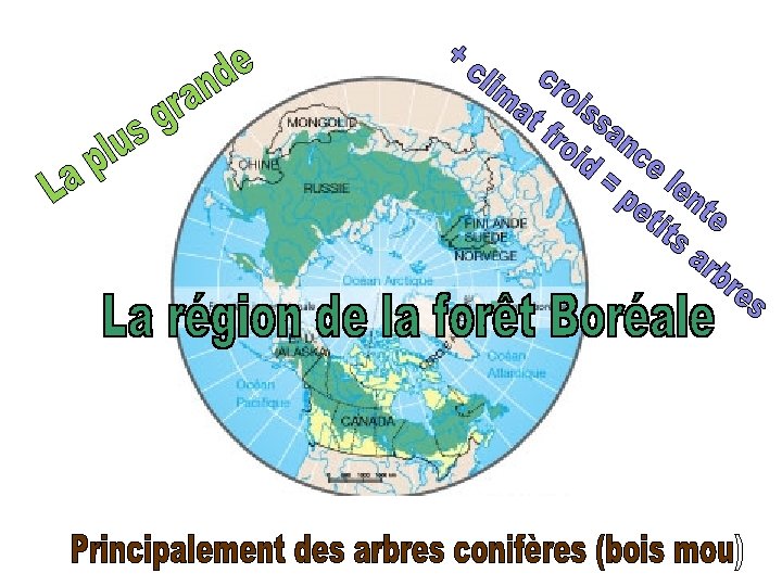 -arbres rabougris -sols minces, saison végétative courte, zones de pergélisol -conifères(épinette, pin, peuplier) -souvent inaccessible