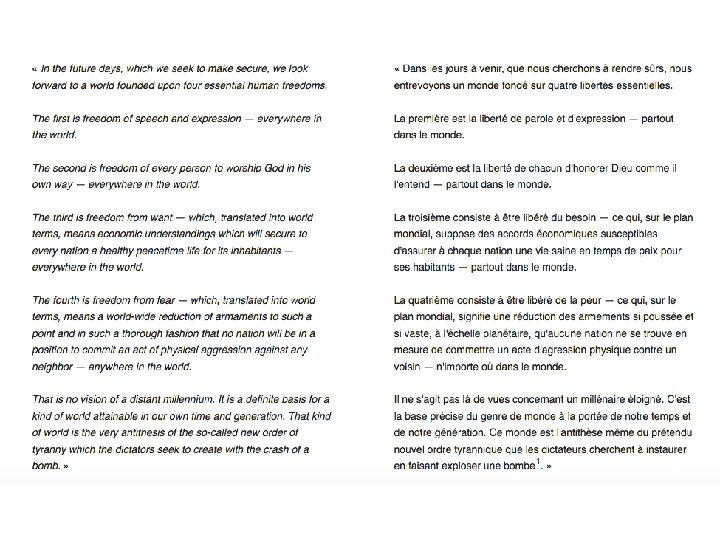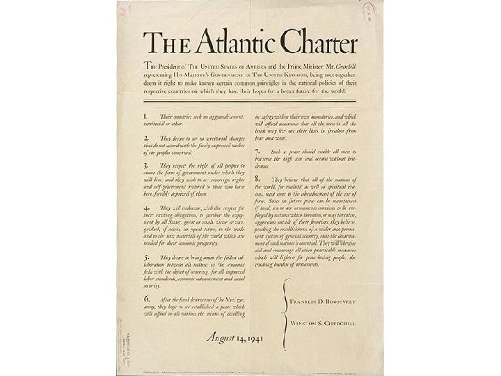 « Le Président des États-Unis et M. Churchill, Premier Ministre, représentant le Gouvernement de Sa Majesté dans le Royaume-Uni s'étant réunis, croient devoir faire connaître certains principes communs de la politique nationale de leurs pays respectifs sur lesquels ils fondent leurs espoirs d'un avenir meilleur pour le Monde. Premièrement, leurs pays ne recherchent aucune expansion territoriale ou autre. Deuxièmement, ils ne désirent voir aucune modification territoriale qui ne soit conforme aux désirs librement exprimés des populations intéressées. Troisièmement, ils respectent le droit qu'ont tous les peuples de choisir la forme de Gouvernement sous laquelle ils entendent vivre ; et ils désirent voir restituer, à ceux qui en ont été privés par la force, leurs droits souverains. Quatrièmement, ils s'efforceront, tout en respectant comme il se doit leurs obligations existantes, d'assurer, sur un pied d'égalité, à tous les États, grands et petits, vainqueurs ou vaincus, l'accès et la participation, dans le monde entier, au commerce et aux matières premières indispensables à leur prospérité économique.