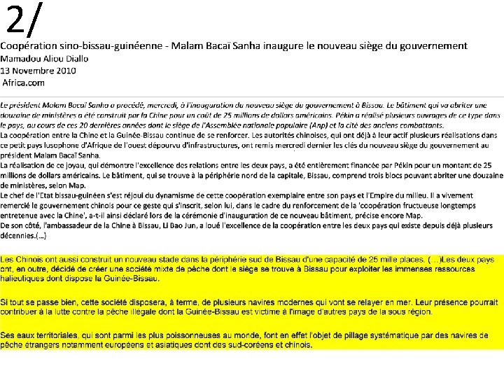 9/ 15 -10 -2009 Le nouveau président Malam Bacai Sanha vote pour la Chine. « Je crois qu’aujourd’hui, il est impératif pour la Guinée-Bissau d’avoir comme premier partenaire la République populaire de Chine » , a-t-il déclaré dans une interview à l’agence chinoise Xinhua. . (…) Sanha : « Je crois qu’aujourd’hui, il est impératif pour la Guinée-Bissau d’avoir comme premier partenaire la République populaire de Chine, afin de préserver nos liens d’amitié. Pour moi, la Chine occupera la première place dans ma priorité (. . . ) La Chine était déjà active dans l’assistance à la Guinée-Bissau. Elle reconstruit le Palais du gouvernement et l’hôpital militaire. Un grand projet agricole se réalise dans la région de Gabu, à 200 km de Bissau. « Nous sommes un pays agricole, nous avons besoin de l’aide et de l’expérience d’autres peuples, notamment celles du peuple chinois qui a maintenant une technologie très avancée » , a expliqué le nouveau président. (…) • . Dans le domaine de la santé, l’hôpital régional de Kangngoukou a été construit par la Chine. Le Palais de la Justice est également l’œuvre de Pékin. Qu’est-ce que la Chine peut bien attendre du troisième pays le plus pauvre au monde, 0, 35 à l’indicateur de développement humain. Petit pays de 36 120 km² pour 1 503 182 habitants qui doit consacrer la moitié de son budget au règlement des salaires des fonctionnaires, dont la moitié pour les seuls militaires. Qui plus est d’une très grande instabilité politique. Depuis la première élection présidentielle pluraliste en 1994, aucun président élu n’a pu terminer son mandat. (…) Le pays occupe aussi une position stratégique. Frontalier du Sénégal et de la Guinée très riches en ressources minières. Elle-même n’en a pas beaucoup. Elle tire 60 millions d’euros, soit 60% de ses recettes d’exportation, de la noix de cajou dont elle le 6 e producteur mondial avec 120 000 tonnes. Les autres ressources, bauxite, bois, pétrole, phosphates, n’ont encore intéressé aucun investisseur. A l’exception du poisson, qui fait l’objet d’un accord de pêche avec l’Union européenne. Mais la Chine sait aller où nul autre investisseur ne va et toutes les ressources sont bonnes à prendre partout dans le monde. En Guinée-Bissau, il lui faudra batailler avec les narcotrafiquants qui ont fait main basse sur le pays. La prochaine visite de Malam Bacai Sanha en Chine, « dans quelques mois, permettra de consolider les relations entre les deux pays » .