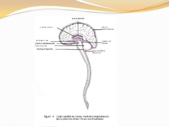 III: le liquide céphalo-rachidien �Dans les ventricules: 25 -30 ml de LCR �Dans le compartiment subarachnoïdien: 100 -110 ml de LCR �La circulation du LCR: - formation au niveau des ventricules latéraux - descend par gravité vers le 3ème ventricule - puis vers le 4ème ventricule