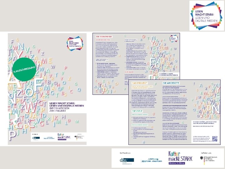 Verwendung von BMBF-Logos Bündnisse sind im Rahmen von „Lesen macht stark: Lesen und digitale Medien“ zur Nutzung der Absendermarke des Bundesministeriums für Bildung und Forschung verpflichtet. Die Logobestandteile „Kultur macht stark“ und „Gefördert von“ bilden EIN Logo. Das Logo darf nicht verändert werden!