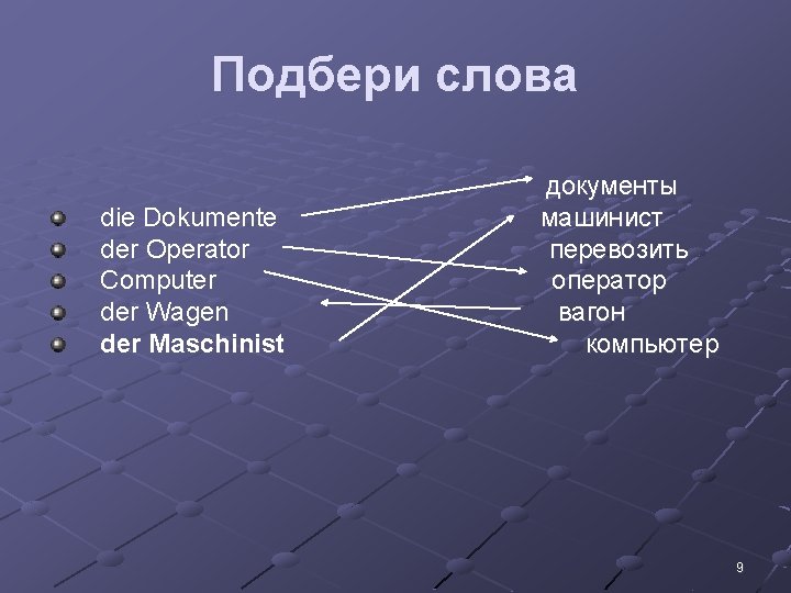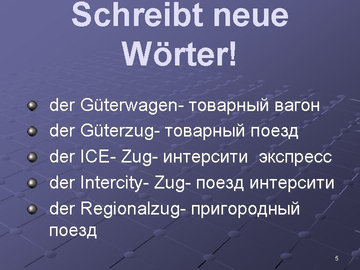 Hört und ergänzt die Pluralform der Substantive! Образуйте множественное число существительных! der Bahnsteig – die _______ der Zug – die _________ der Fahrplan – die _______ das Gleis - die _________ 7