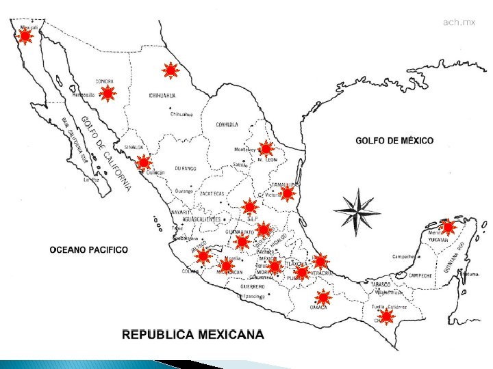Hospitales � � � INC Ignacio Chávez INN Salvador Zubirán CMN Siglo XXI CMN La Raza CMN 20 Noviembre Hospital Central Militar Hospital Juárez Hospital General México Hospital Central Sur PEMEX Hospital Español Centro Médico ABC Grupo Ángeles � � � � � CMN Occidente Gdl Hospital Civil de Gdl UMAE 34 de Monterrey UMAE 25 de Monterrey Hospital Universitario Monterrey Hospital Civil de Morelia Hospital Central San Luis Potosí Hospital TEC 100 Querétaro ISSEMYM