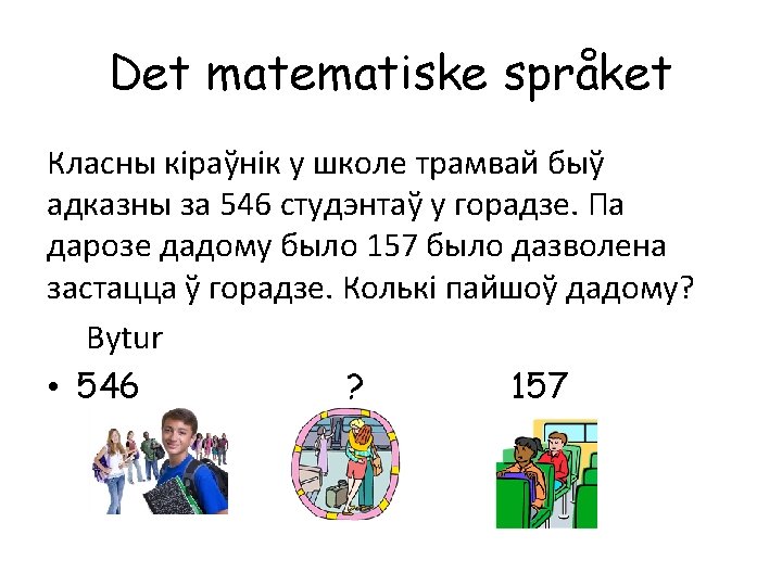 Det matematiske språket Ø Opplysningene spredd tilfeldig rundt Ø Konsistente oppgaver lettest (Ostad, 1998) Ø Svake elever plukker ut opplysningene i rekkefølge og setter de inn i en regneoppstilling som de gjerne gjetter seg fram til når de er usikre
