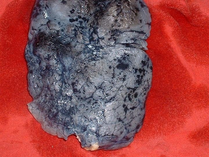 Antracosis Origen: minas de carbón, contaminación atmosférica Inhalación antracosis pulmonar Macrófagos alveolares ganglios linfáticos Consecuencias: Inerte Pneumoconiosis