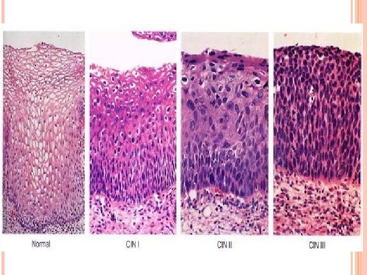 NEOPLASIA CERVICAL INTRAEPITELIAL (CIN) Antes conocida como “displasia” Crecimiento y desarrollo desordenado del epitelio del cérvix Lesión que puede progresar a carcinoma invasor Los tipos se clasifican de acuerdo a los sistemas: Bethesda � CIN/Displasia � Papanicolaou �