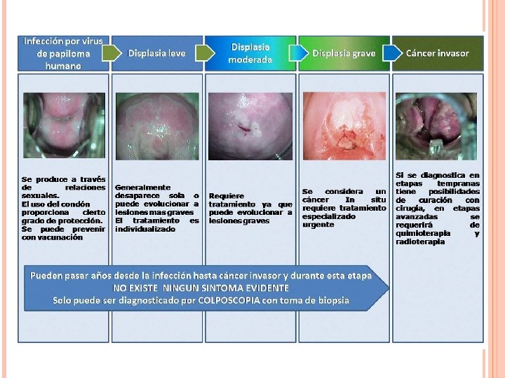 CUADRO CLÍNICO Mayoría de las veces es asintomático y no hay signos Frecuentemente diagnosticado mediante biopsia posterior a un resultado anormal en la citología Detección temprana y prevención son cruciales Toda mujer mayor de 21 años, o inicio de historia sexual hace 3 años deben someterse a una exploración pélvica y frotis citológico