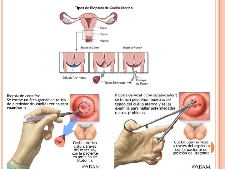 BIOPSIA DIAGNÓSTICA POR CONO Se realiza posterior a una evaluación colposcópica se realizaría la biopsia cervical en cono Indicaciones: Colposcopía insatisfactoria � Lesión que se extiende al conducto endocervical � Discrepancia entre el diagnóstico histológico de la biopsia dirigida y el examen citológico � Sospecha de adenocarcinoma in situ � Carcinoma microinvasor �