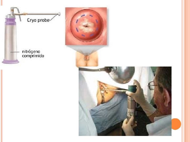 CRIOTERAPIA Procedimiento de consultorio que no requiere de anestesia Se utiliza óxido nitroso o bióxido de carbono como refrigerante para una sonda fría de muy bajas temperaturas La criosonda se coloca en el ectocérvix cubriendo toda la lesión y luego se activa La técnica más efectiva es realizar 2 ciclos de congelación- descongelación- congelación Destruye el epitelio superficial del cuello del útero al cristalizar el agua intracelular provocando la destrucción de la célula