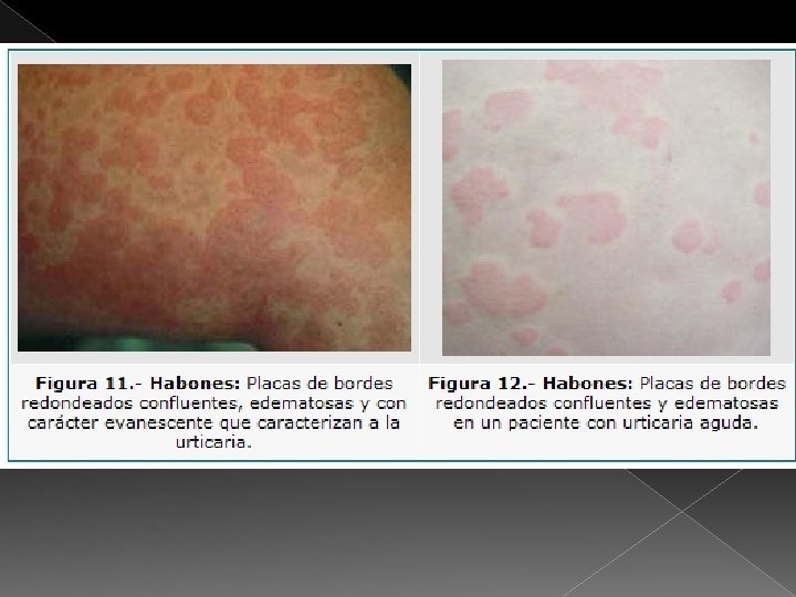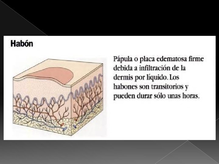• Los habones consisten en erupciones de pequeños milímetros o varios centímetros. • De coloración blanca o rojiza, rodeados generalmente de una halo eritematoso y que frecuentemente produce prurito.