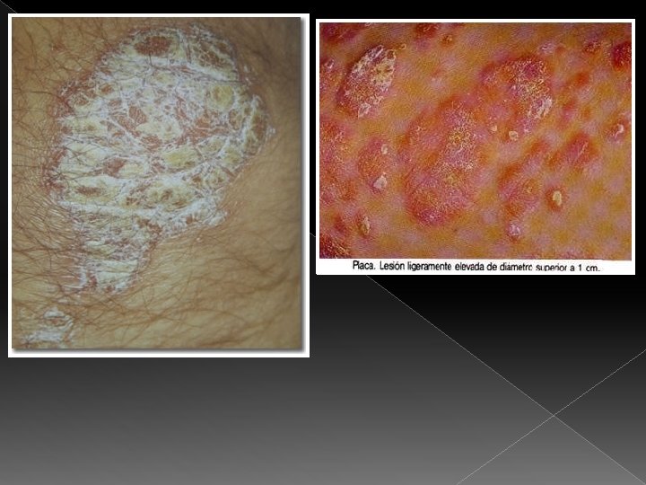 PLACA Elevada, plana, firme y rugosa. Superficial de mas de 1 cm de diámetro que puede deberse a coalescencia de pápulas pequeñas, ejemplo: psoriasis,