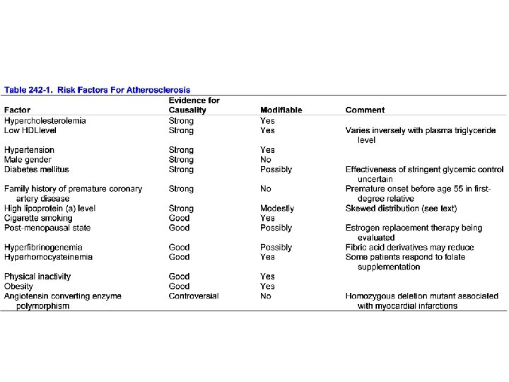 FATTORI DI RISCHIO PER ATEROSCLEROSI: IMPLICAZIONI FISIOPATOLOGICHE Forte evidenza di causalità Ipercolesterolemia Ipertensione Buona evidenza di causalità Ridotta espressione LDL-R, Aumento LDL circolanti, Aumentata probabilità ossidazione e deposito nell’intima Alterazioni endoteliali e aumentato adsorbimento di LDL nell’intima Genere maschile Mancata protezione da parte di ormoni sessuali femminili (vedi poi), Abitudini di vita, Altri (? ? ) Diabete mellito Glicosilazione di proteine della superficie endoteliale e dell’intima vascolare, Alterazioni metaboliche (Tipo II) Storia famigliare di prematura CAD Elevati livelli di lipoproteina (a) Fumo da sigaretta Stato postmenopausale Alterazioni recettori per LDL, Alterazioni Apoproteine, Neosintesi ed eliminazione colesterolo (? ? ) Aumentate complicanze trombotiche Alterazioni endoteliali ed aumentata ossidazione LDL Regressione di alto rapporto HDL/VLDL tipico di donne in età fertile Iperfibrinogenemia (e aumento coagu-labilità del sangue) Aumentate complicanze trombotiche Inattività fisica Riduzione HDL, Ridotto utilizzo colesterolo, Altri Obesità Iperomocisteinemia Ipertensione ealterazioni metaboliche Alterazioni endoteliali