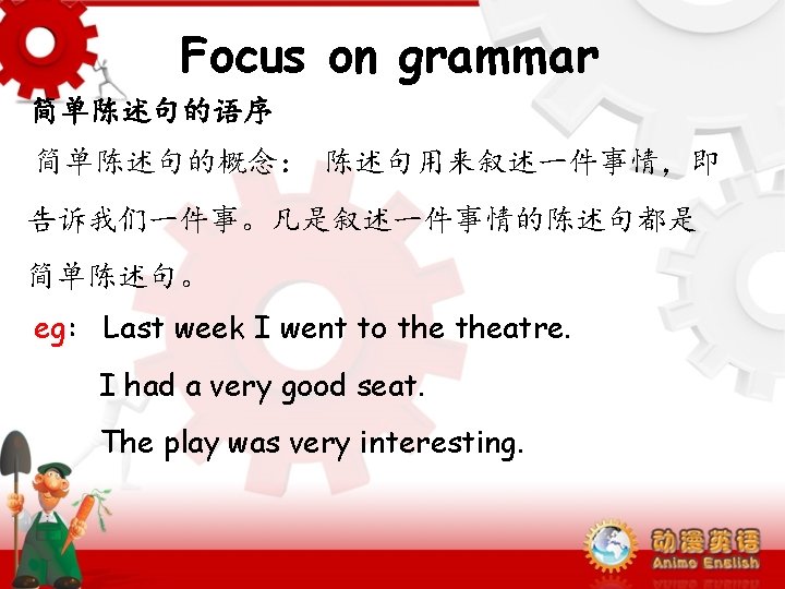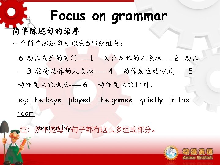 Focus on grammar 简单陈述句的语序 6 1 2 3 4 5 6 动作发生的 时间 发出动作 的人或物 动作 接受动作的 人或物 动作发 生的方 式 动作发生 的地点 动作发生的 时间 Last week I can swim. I had I went They were talking Loudly. The boys played the games quietly a very good seat. to theatre. in the room yesterday.
