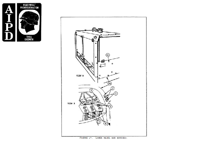 Step 2. Check for and tighten all loose cable connections. Step 3. Check for dirty or defective generator brushes. If brushes are dirty or defective, replace them as follows: (Refer to figure 17 on the following page. ) (a) It is assumed that the lower panel (4) has been removed to provide access to the brush rack (3). (b) Tag and remove the wire leads from the brush rack caps (5). (c) Remove two bolts (1), two lockwashers (2), and the brush rack (3) from the housing (4 a). (d) Unscrew and remove the brush rack caps (5). (e) Push the brushes (6) up and out of the brush rack (3).