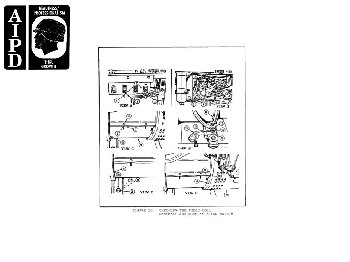 self-tapping bolt (4)(figure 20, view B, on the previous page), and lower the mode selector switch (5). (c) Tag and remove the wire leads from the mode selector switch (5). (d) Remove the two nuts (6)(figure 20, view C), two lockwashers (7), two screws (8), and cover (9) from the field coil assembly housing (10). (e) Remove the mode selector switch (5)(figure 20, view B). (f) Remove the nut (11)(figure 20, view D), lockwasher (12), bolt (13), flat washer (14), ground cable (15), and lockwasher (16) from the left side of the field coil assembly housing (10). (g) Remove the nut (17)(figure 20, view E), lockwasher (18), bolt (19), and flat washer (20) from the right side of the field coil assembly housing (10).