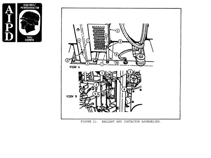 h) Support the rear of the engine with a hoist connected to the engine rear head lifting eye. Step 7. Check for defective ballast assembly. If defective, replace as follows: (Refer to figure 21, view A, on the following page. ) (a) Tag and remove ballast electrical wire. (b) Remove two nuts (1) and two lockwashers (2) from inside the welding machine frame. (c) Support the ballast assembly (5) and remove the nut (6), lockwasher (7), bolt (8), and flat washer (9) from bracket (10). (d) Remove the ballast assembly (5). (e) Procure and install a new ballast assembly in the reverse order of removal